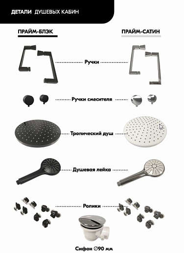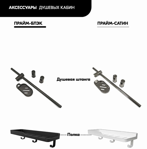 В комплекте: сифон, душевой набор с лейкой на гибком шланге и верхним душем, полочка с крючками, поддон с бортиком.