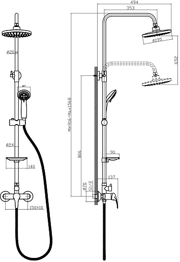 Смеситель, лейка, шланг, штанга, верхний душ, крепление