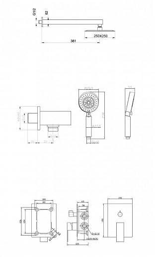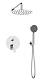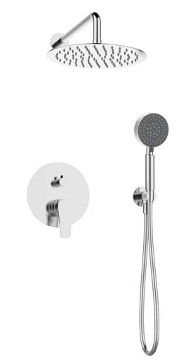 - Оснащение: встраиваемый смеситель с переключателем на два выхода, верхний душ диаметр 25 см с изливом, ручной душ со шлангом, штуцером и держателем.