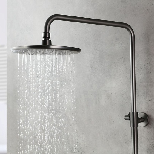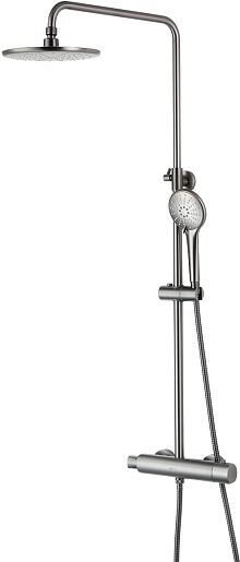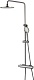 Комплектация: термостатический смеситель, шланг, душевая лейка, держатель лейки, верхний душ, штанга.