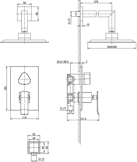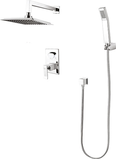 Комплектация: смеситель, шланг, душевая лейка, шланговое подключение, держатель лейки, верхний душ.