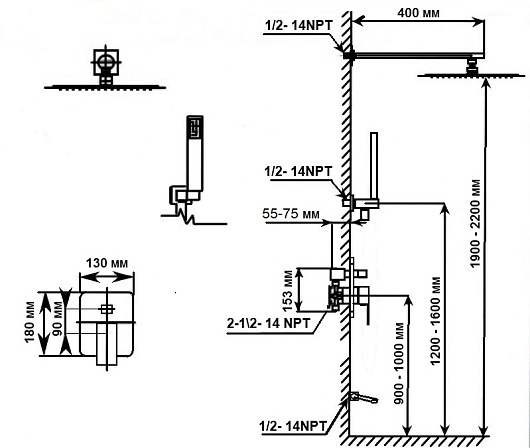- Вынос верхнего душа: 40 см.