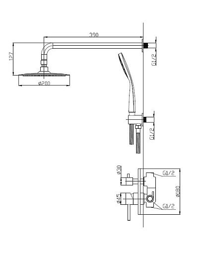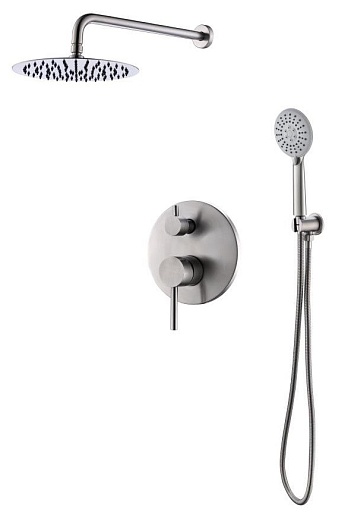 - Оснащение: встраиваемый смеситель с переключателем, верхний душ диаметр 25 см с изливом, ручной душ со шлангом, штуцером и держателем.