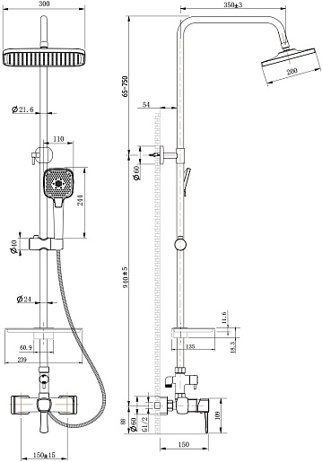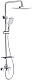 Комплектация: смеситель, шланг, душевая лейка, держатель лейки, верхний душ, штанга, полочка.