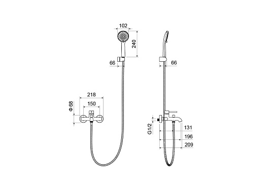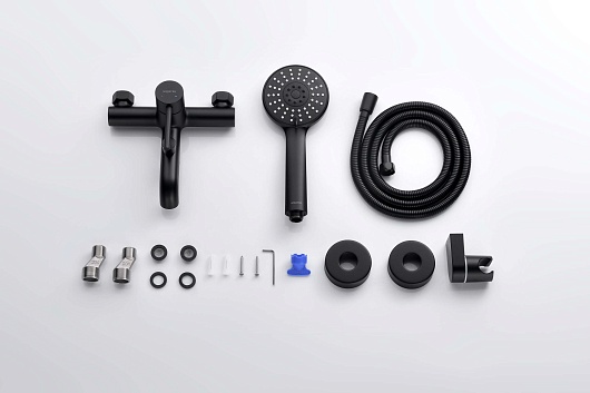 - Оснащение: душевой шланг / душевая лейка / настенный держатель.