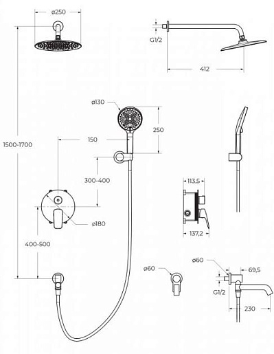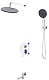 - Оснащение: встраиваемый смеситель с переключателем на два выхода, верхний душ с кронштейном, излив для ванны, ручной душ 3-х режимный со шлангом, штуцером и держателем.