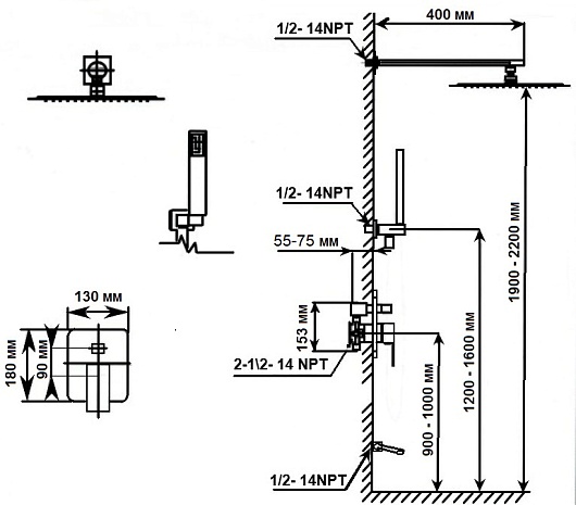 - Верхний душ: нержавеющая сталь, диаметр 25 см.
