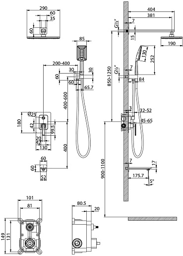 - Размер верхнего душа: 290x190 мм.