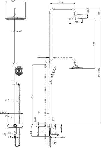 Комплектация: смеситель, шланг, душевая лейка, держатель лейки, верхний душ, штанга.