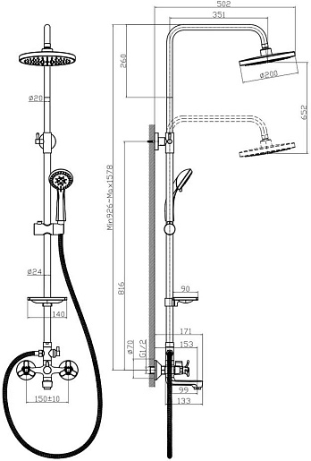 Смеситель, лейка, шланг, штанга, верхний душ, крепление