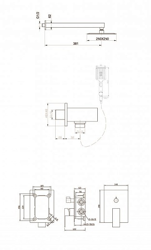 - Оснащение: встраиваемый смеситель с переключателем на два выхода, верхний душ диаметр 25 см, ручной душ 3-х режимный со шлангом, штуцером и держателем.