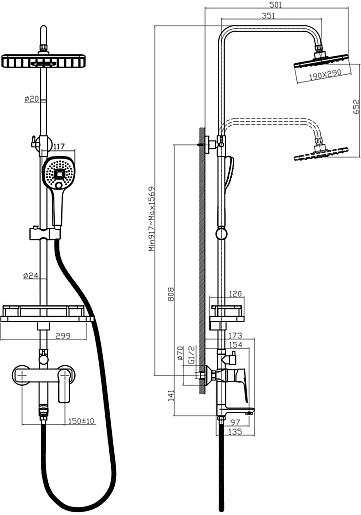 - Размер верхнего душа: 190x290 мм.