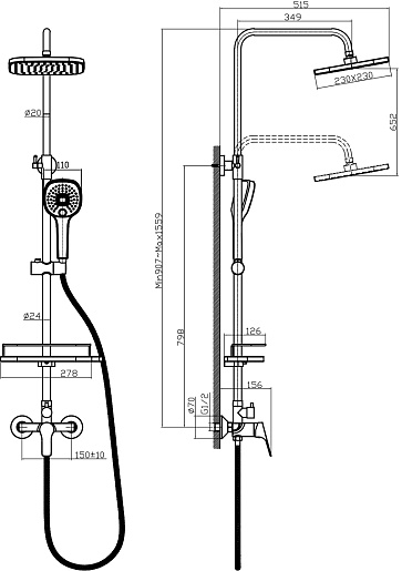- Размер верхнего душа: 230x230 мм.