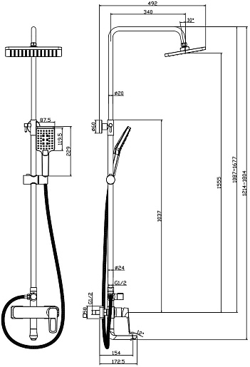 Смеситель, лейка, шланг, штанга, верхний душ, крепление