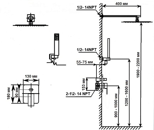 - Верхний душ: нержавеющая сталь, диаметр 25 см.