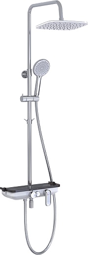 Комплектация: смеситель, шланг, душевая лейка, держатель лейки, верхний душ, крючок, штанга.