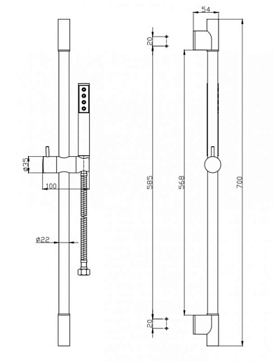 - Оснащение: регулируемый держатель ручного душа, ручной душ с душевым шлангом.