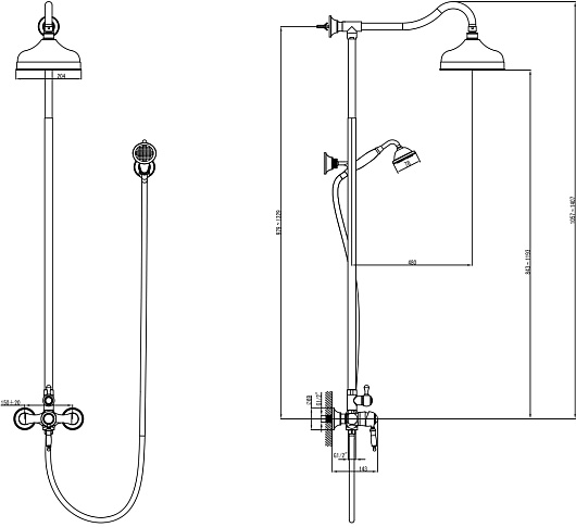 Комплектация: смеситель, шланг, душевая лейка, держатель лейки, верхний душ, штанга.