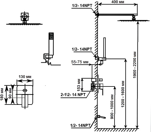 - Вынос верхнего душа: 40 см.
