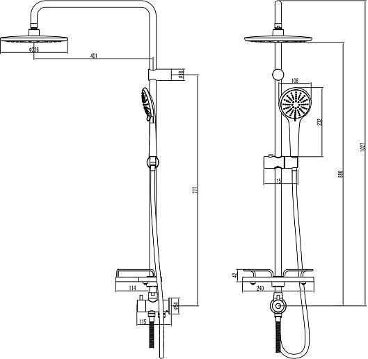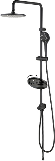 Комплектация: душевая штанга, шланг, душевая лейка, держатель лейки, верхний душ, полочка.