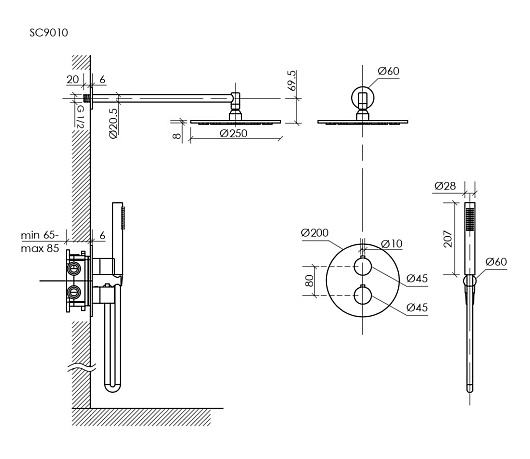 - Размер верхнего душа: 25 см.- Вылет верхнего душа: 40 см.