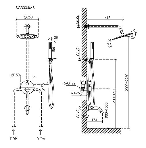 - Размер верхнего душа: 25 см.- Вылет верхнего душа: 41.3 см.