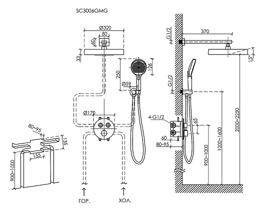 - Размер верхнего душа: 32 см.- Вылет верхнего душа: 37 см.