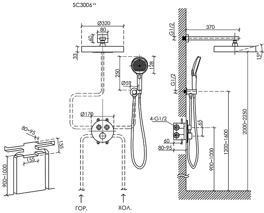 - Размер верхнего душа: 32 см.- Вылет верхнего душа: 37 см.