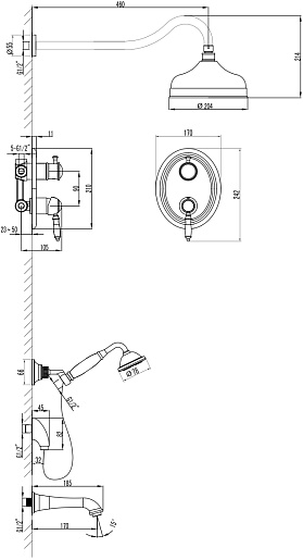 Комплектация: смеситель, шланг, душевая лейка, шланговое подключение, держатель лейки, излив, верхний душ.