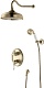 Комплектация: смеситель, шланг, душевая лейка, шланговое подключение, держатель лейки, верхний душ.