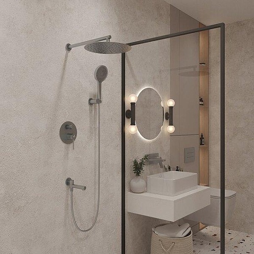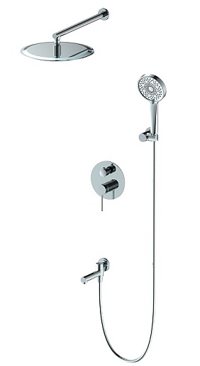 - Состав комплекта: верхний душ, душевой гарнитур, излив, смеситель для ванны с душем, настенный держатель.
