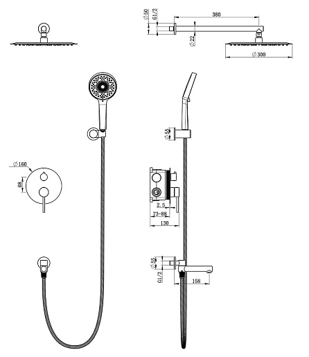 - Состав комплекта: верхний душ, душевой гарнитур, излив, смеситель для ванны с душем, настенный держатель.