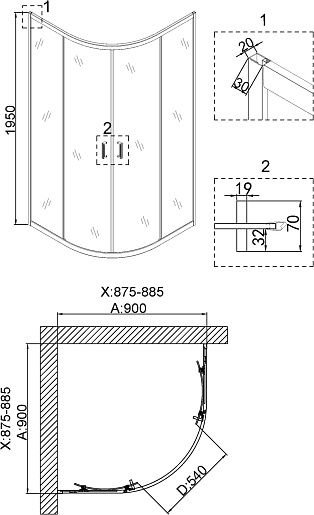 - Размер (ШxГxВ): 90x90x190 см.