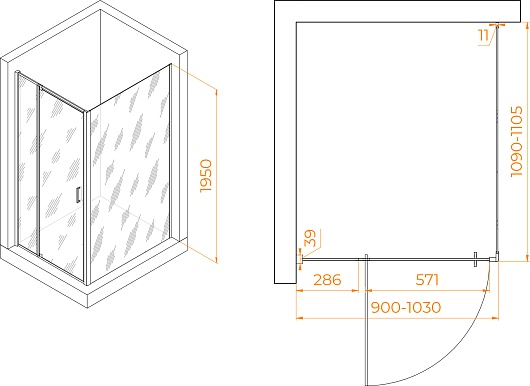 - Размеры с диапазоном регулировок (ШxГ): 900-1030 x 1090-1105 мм.