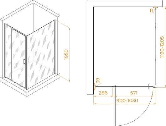 - Размеры с диапазоном регулировок (ШxГ): 900-1030 x 1190-1205 мм.