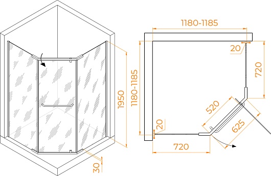 - Размеры с диапазоном регулировок (ГxШ): 1180-1185 x 1180-1185 мм.