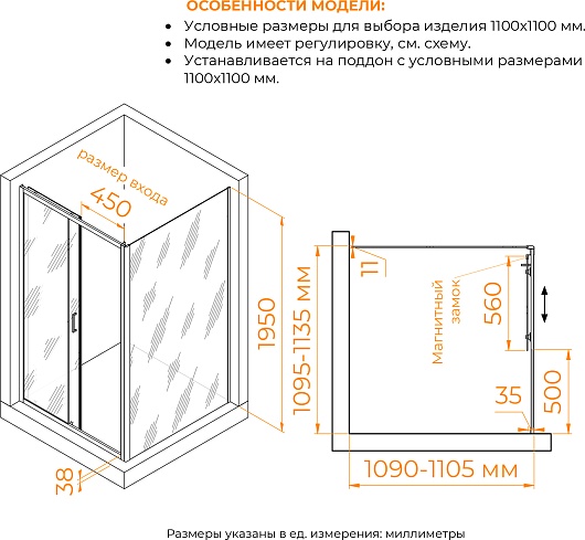 - Размеры с диапазоном регулировок (ШxГ): 1095-1135 x 1090-1105 мм.