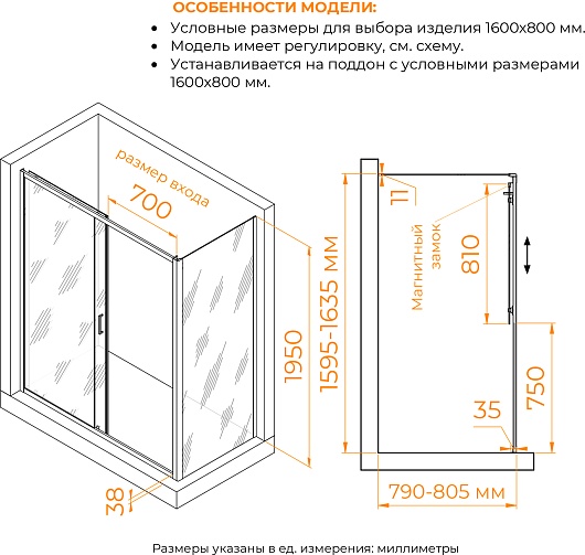 - Размеры с диапазоном регулировок (ШxГ): 1595-1635 x 790-805 мм.