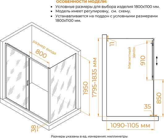 - Размеры с диапазоном регулировок (ШxГ): 1795-1835 x 1090-1105 мм.