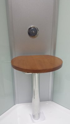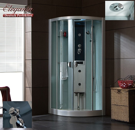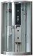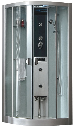 Функциb: пар, сенсорный пульт, радио FM, вентилятор, верхний свет, душевая лейка на стойке, ручной душ, две форсунки, держатель полотенца, стеклянная полка, ручки латунь-хром, ролики двойные металлические.