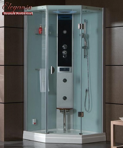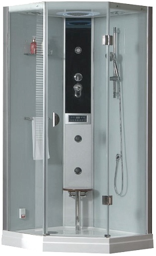 Функции: пар, радио, вентилятор, верхний свет, душевая лейка, форсунки, ручной душ.