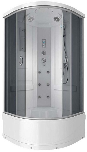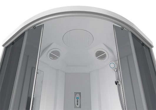 Внутри кабины имеются ручной и верхний душ, есть гидромассаж на шесть форсунок, верхний свет и вентилятор, управление которыми осуществляется с помощью кнопочного пульта. Установлены зеркало и небольшая, но вместительная полочка. Акриловый поддон – 42 см.
