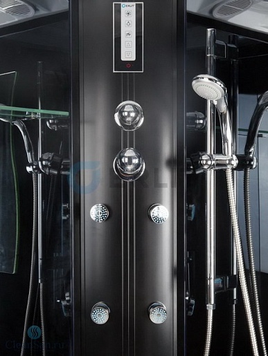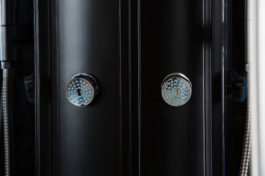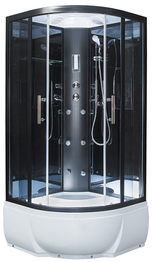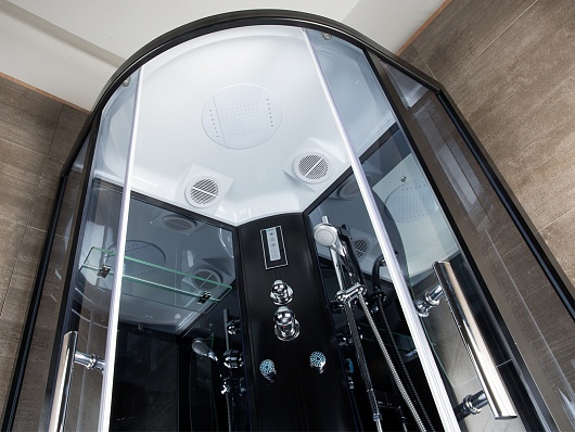 Корпус кабины исполнен в элегантном чёрном цвете, стёкла раздвижных дверей – тонированные. толщиной 4 миллиметра. Задняя стенка – зеркальная. Центральная стойка изготовлена из безопасного пластика. Дополнительно имеется зеркало, полочка для вещей, вентилятор и FM-радио. В тёмно время суток можно включить верхний свет. Управлять функциями кабинки можно с помощью влагозащищённого сенсорного пульта.