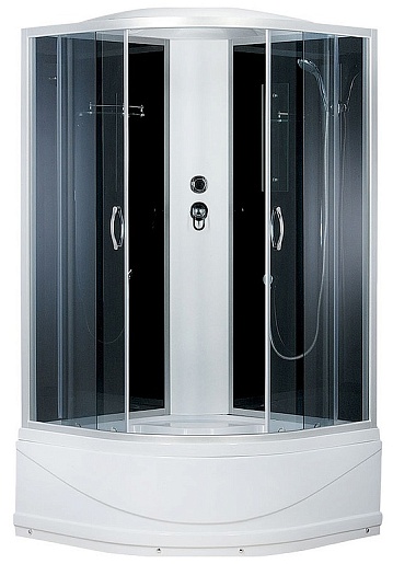 Для водных процедур предусмотрены как ручной, так и верхний душ. Внутри размещена удобная полочка для аксессуаров, зеркало, а также сиденье. Кабина выполнена в белом цвете, который контрастирует с чёрными стёклами, что придаёт ей особый колоритный внешний вид. Материал поддона – белый акрил с нескользящими свойствами.