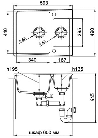 - Размеры чаш: 340х440х195 мм, 167х295х135 мм.
