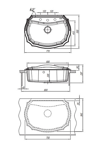 - комплектация: отводная арматура с выпуском 3 1/2" (D=90) и переливом, набор крепежей, трафарет для вырезания столешницы, технический паспорт, гарантийный талон.