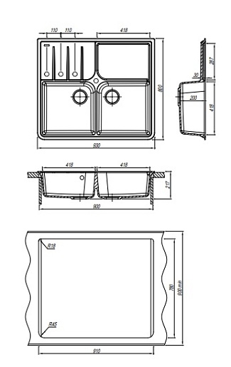 - комплектация: отводная арматура для двух чаш с выпусками 3,5 дюйма (D=90 мм) и переливом.