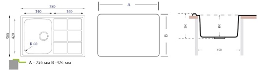 - размер монтажного отверстия под мойку (ШхГ) – 756х476 мм