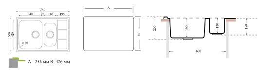 - размер монтажного отверстия под мойку (ШхГ) – 756х476 мм