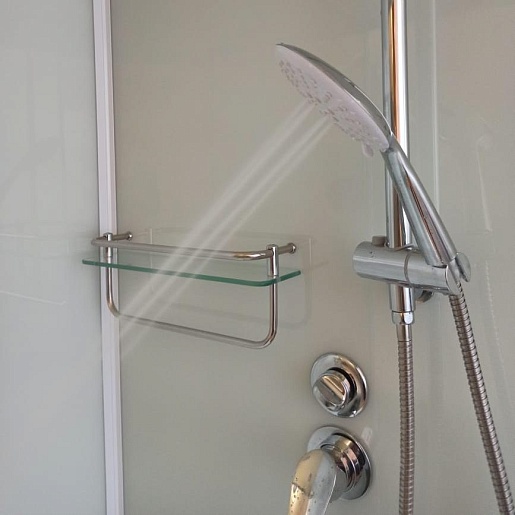 - Стеклянная полочка с ограничителем и вешалкой для банных аксессуаров.